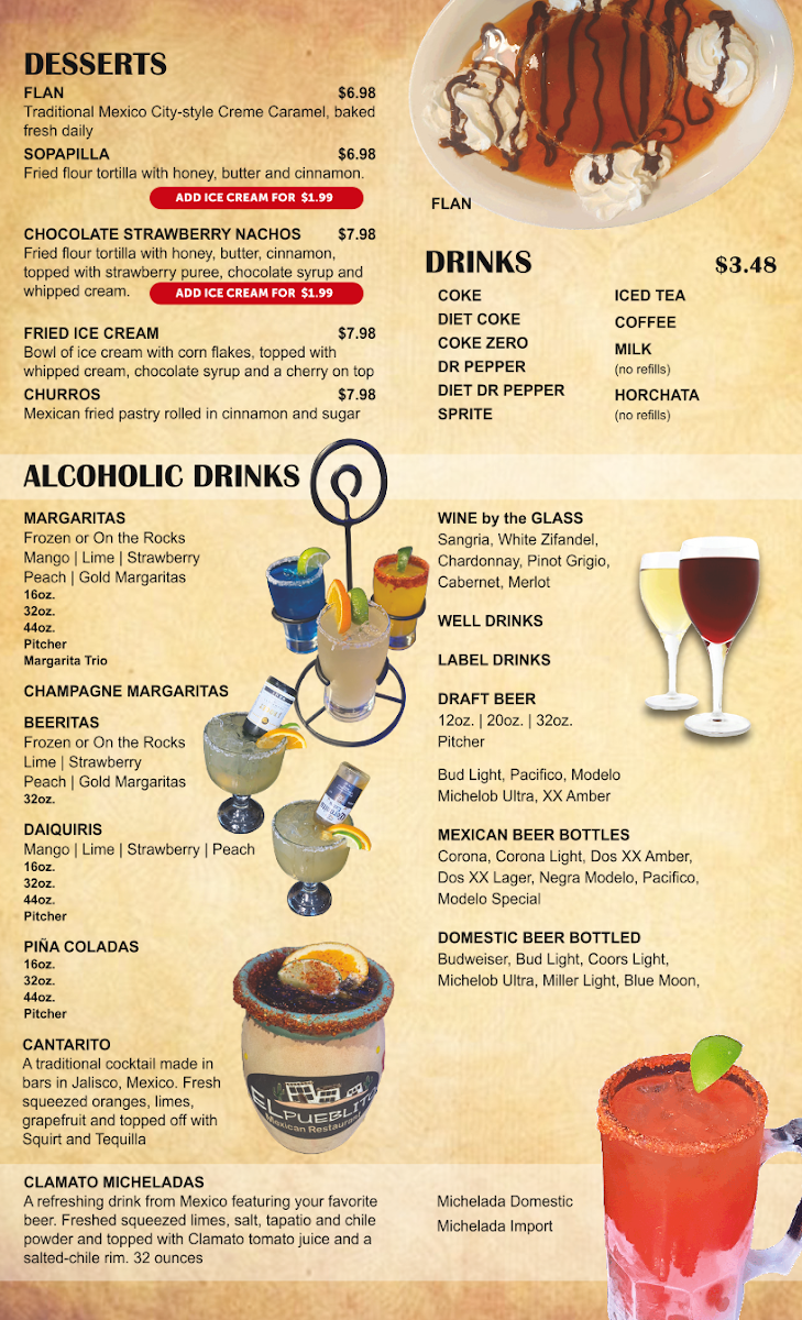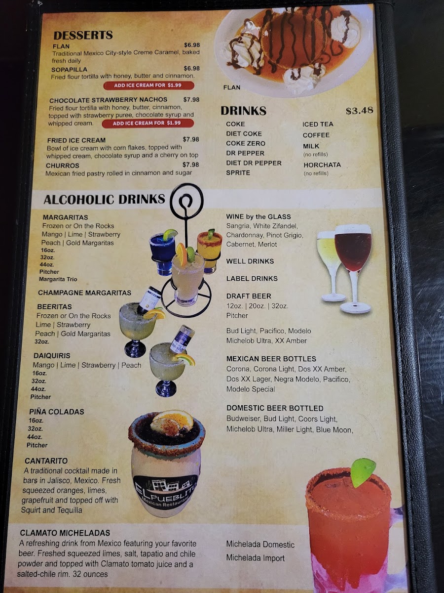 The highlight of the menu includes delicious vegetarian combinations, such as Combination A, featuring a chalupa, cheese enchilada, and refried beans, all for just US$10.88. For those who crave something meaty, try the Burrito El Pueblito or the mouthwatering El Toro, a poblanos pepper stuffed with grilled chicken, shrimp, and bacon, topped with a luscious cheese sauce.